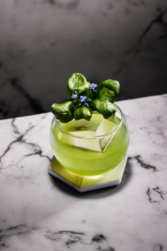 Add fresh basil leaves, lime juice, simple syrup and Fluère Botanical in a shaker