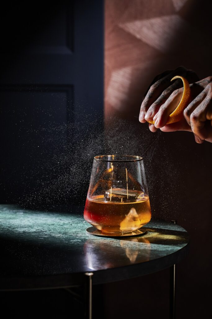 Add Fluère Spiced Cane, whiskey, simple syrup, and bitters into a mixing glass with ice. Stir gently until well chilled. Strain into an old fashioned glass over a large ice cube. Express the orange zest over the drink and garnish with it.